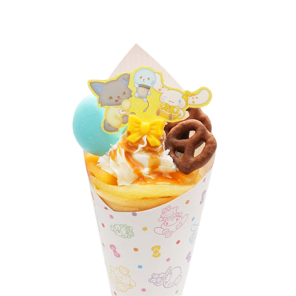 シナモロールとピーハイとマイクンのりんごとプレッツェルショコラのキャラメルクレープ
